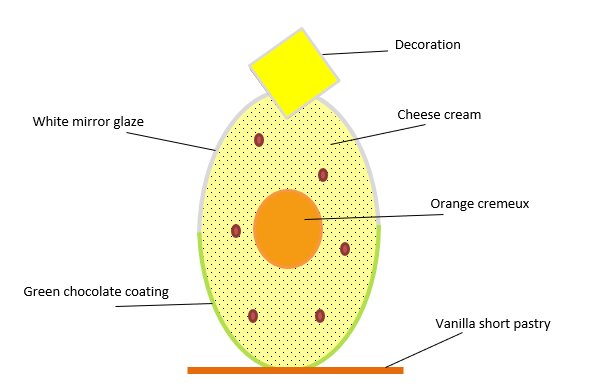An original take on the traditional Easter Paskha. The whimsical shape of an egg, a thematic Easter decoration and an interesting combination of flavours: cheese mass, orange cremeux and shortbread vanilla cake, will look good on any festive table.