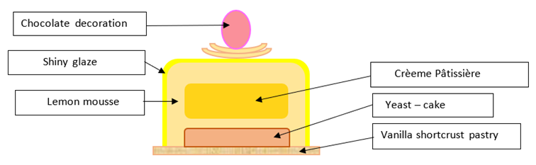 Soak the gelatine in cold water. Bring the cream to boil, add the soaked gelatine and pour the mixture over the chocolate, adding the lemon paste. Add the whipped cream and gently mix all together. Pour half of the mousse into a silicone mould, insert the crème pâtissièreand pour the remaining mousse onto it. Finally put the baked yeast cake on it and freeze.